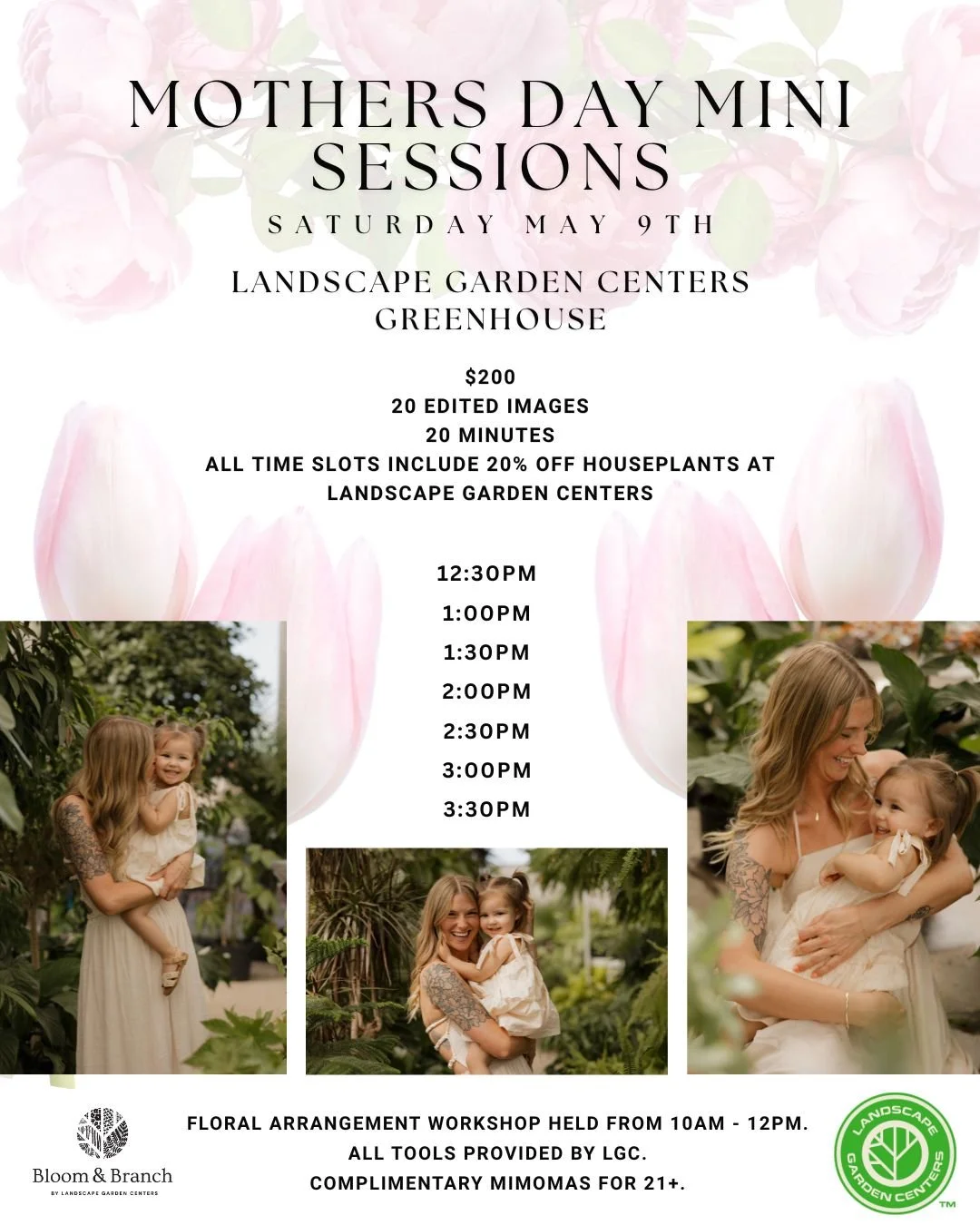 I’m teaming up with Landscape Garden Centers for a special day! There’s a Mom & Me flower basket workshop from 10am–12pm, and I’ll be offering mini sessions right after. You don’t need to attend the class to grab your spot! (But why not do both?!)